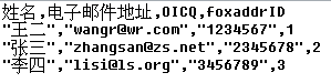 echo "姓名,电子邮件地址,OICQ,foxaddrID"; //输出第一行,Foxmail地址簿的字段
