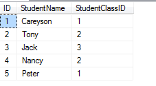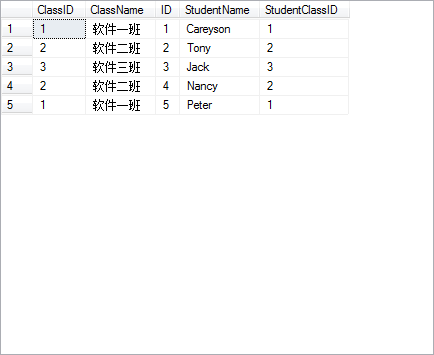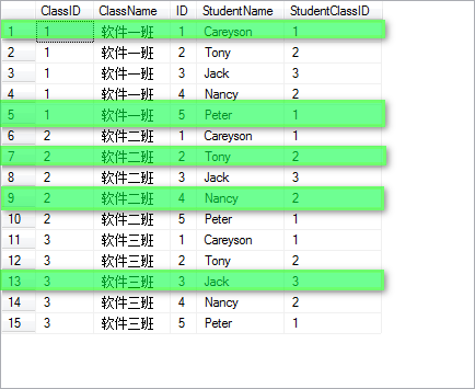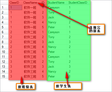 然后通过on后面的限制条件,只选择那些StudentClassID和ClassID相等的列(上图中划了绿色的部分),最终,得到选择后的表的子集