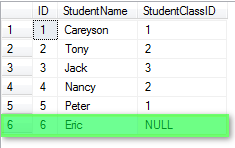 假设还是上面两个表,学生和班级.我在学生中添加一个名为Eric的学生,但出于某种原因忘了填写它的班级ID: