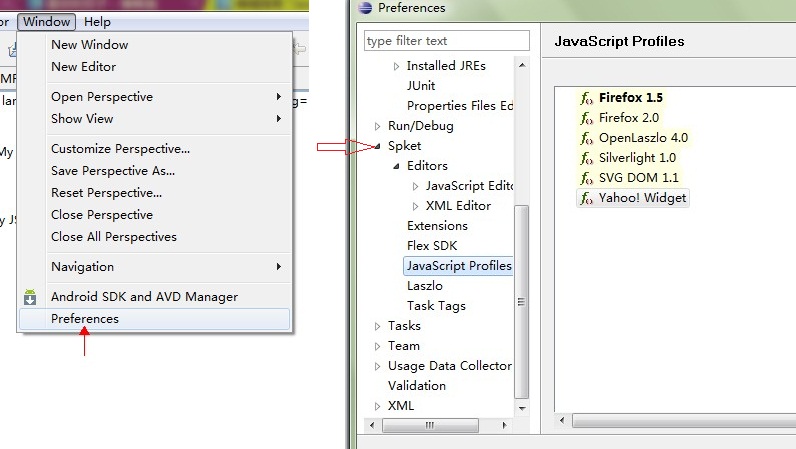 打开以后,可以看到window菜单下preference选项里面有了spket,就是我们刚才说的插件了,至于怎么用,今后会提到的。