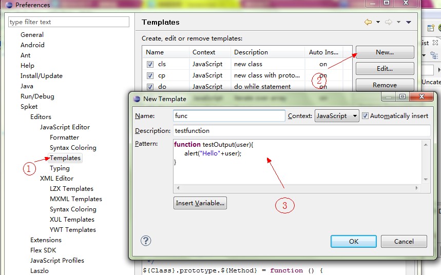 这样大家就明白了吧~ spket可以用来自定义提示,同时它已经自带了js的模板,自己点点preference下spket里的各个东西,也就差不多熟悉了。