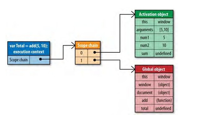 当执行 add 函数的时候, JavaScript 会创建一个 Execute context (执行上下文),执行上下文中就包含了 add 函数运行期所需要的所有信息。 Execute context 也有自己的 Scope chain, 当函数运行时, JavaScript 引擎会首先从用 add 函数的作用域链来初始化执行上下文的作用域链。