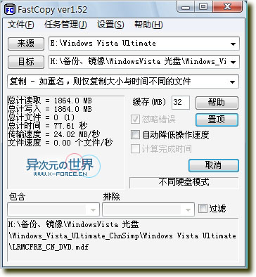 X-Force再次实际测试,在 笔记本(希捷80G 5400转) 和 移动硬盘(希捷250G 7200转+元谷星钻SATA硬盘盒+USB2.0接口)间拷贝Windows Vista的光盘镜像,速度最高达到了26.8MB/秒的速度!(截图不是最快时截的)比Windows自带的复制粘贴功能剩下了近5分钟的时间!如果你也经常在磁盘间(不同盘符或不同硬盘)拷贝较大的文件,FastCopy绝对不会让你失望!