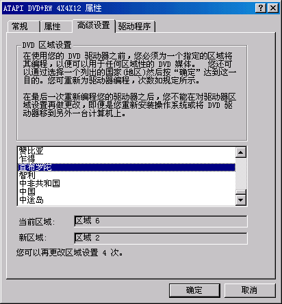 双击刻录机查看设备属性,在高级中显示的DVD区域设置。也不用做更改。
