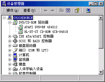 进入win2000(不过笔者还是建议家庭用户使用windowsXP,会有很多针对刻录的新特性,操作变得简单方便),设备管理器显示安装的刻录机DVD+RW 4X4X12。