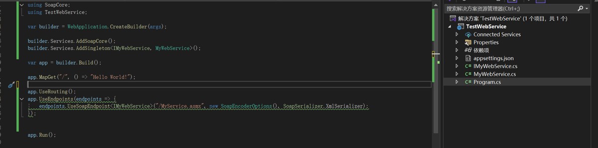 // 注册服务 builder.Services.AddSoapCore(); builder.Services.AddSingleton<IMyWebService, MyWebService>();