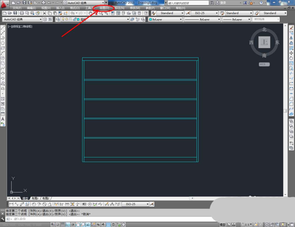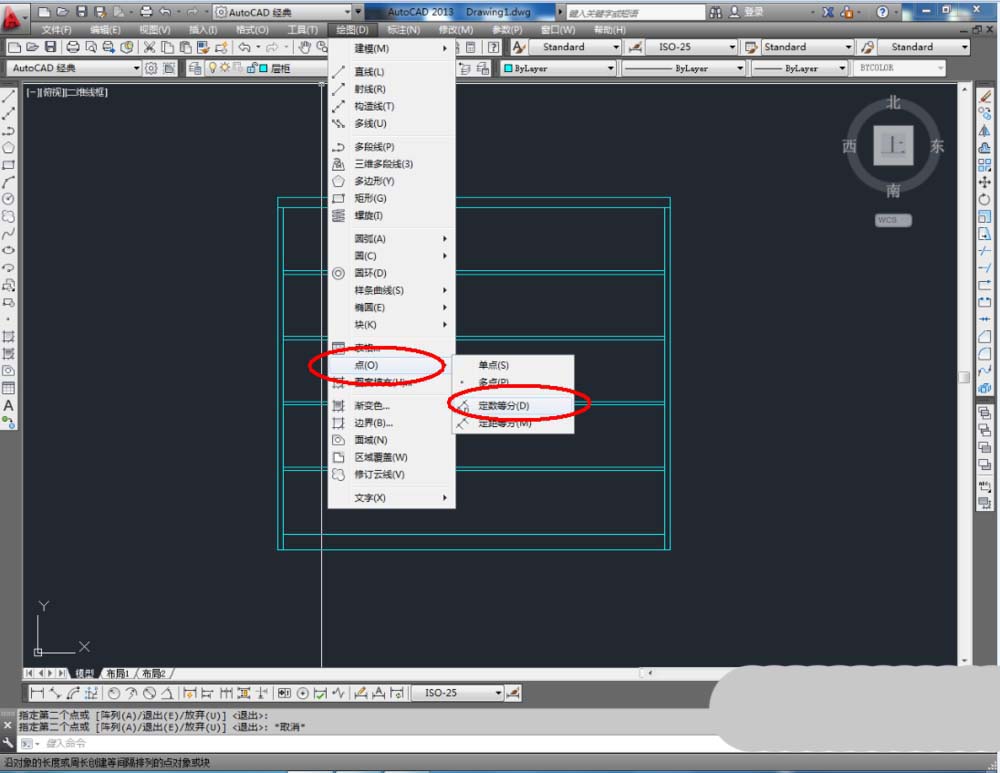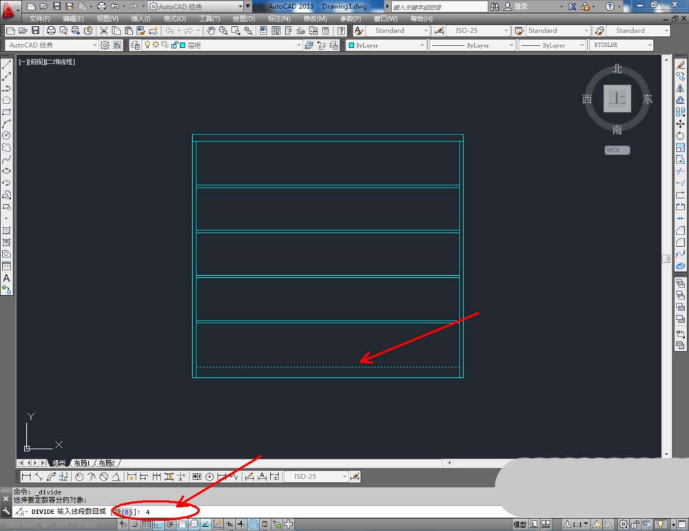 6、点击【绘图】-【点】-【定数等分】,将图示选线分为四等分和五等分。最后,按图示完成中隔板部分图案的绘制,这样我们的层柜平面图就全部制作完成了。