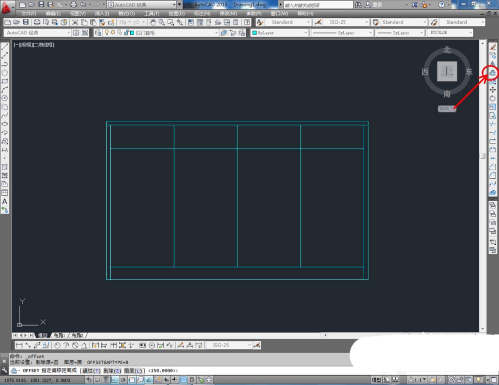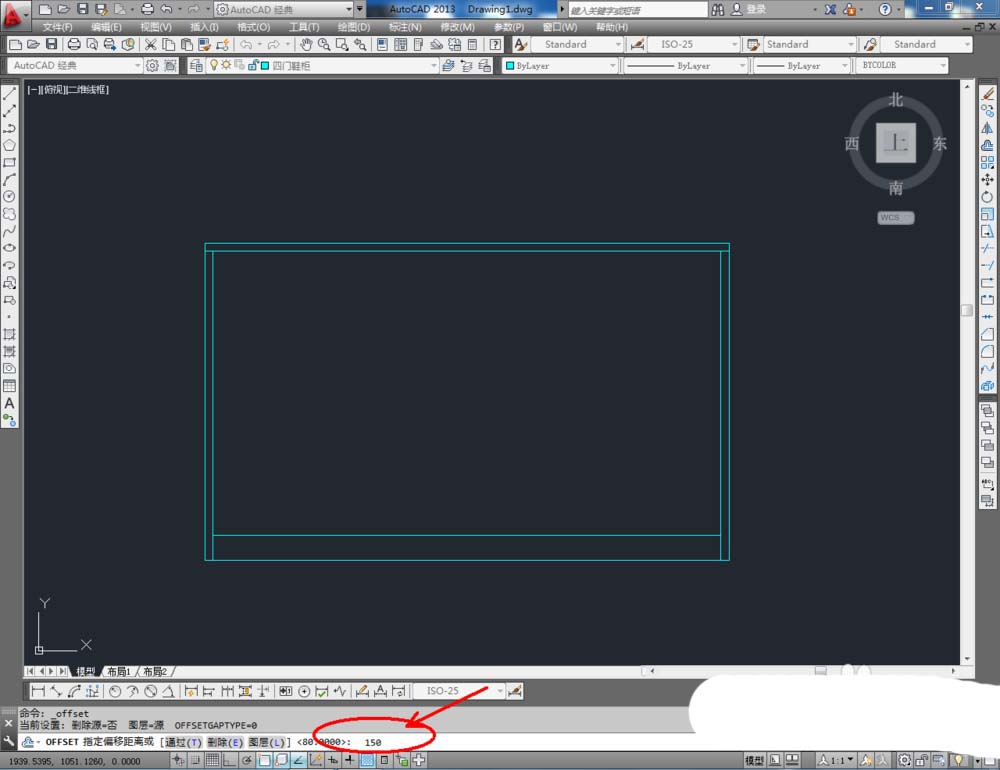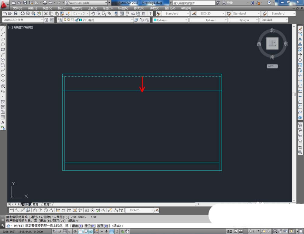 4、点击【偏移工具】,在命令栏输入偏移数值:150后,对图示选边进行向下偏移并调整好选边上的端点位置;