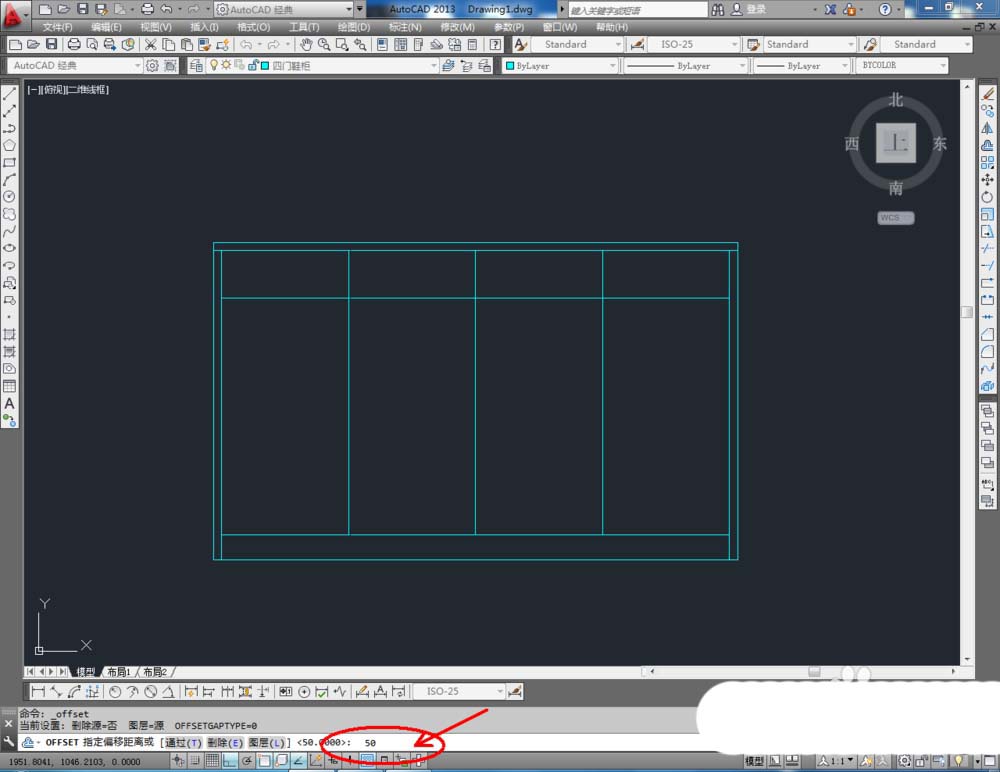 3、点击右边工具栏中的【偏移工具】,在命令栏输入偏移数值:25后,对图案顶边和左右两侧边进行向内偏移。命令栏中输入偏移数值:80,对底边进行向上偏移。完成后,按图示调整好选边上的端点位置(如图所示);