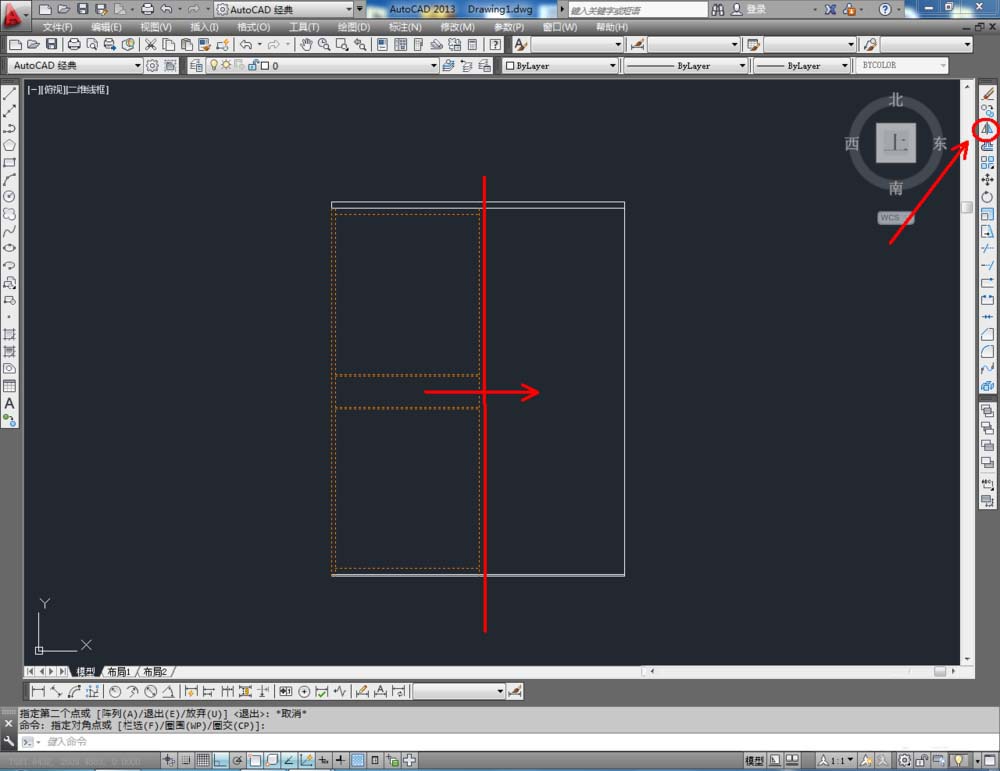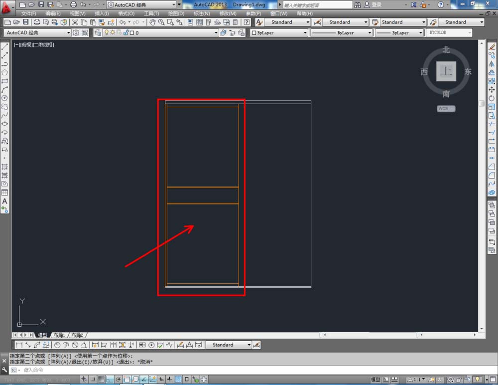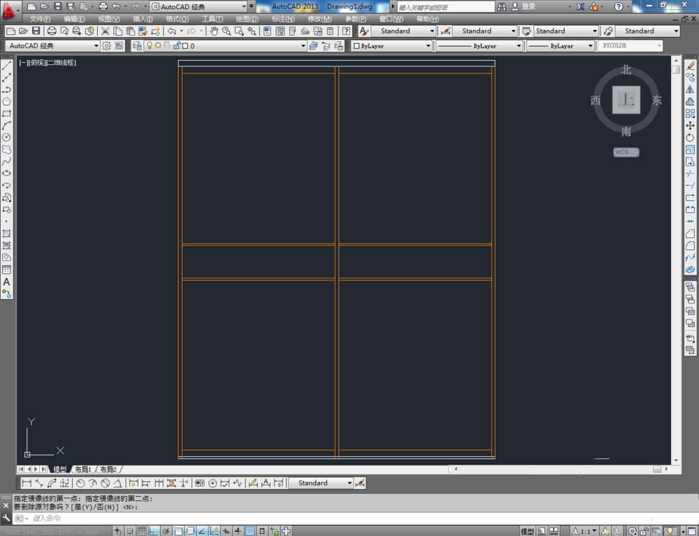 4、选中绘制好的门页,点击【镜像】,将移门门页沿着柜体中心线进行镜像操作,绘制出另一个门页;
