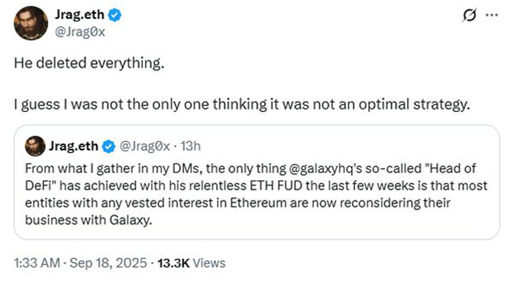前Consensys产品经理Jimmy Ragosa批评了Marcantonio和Galaxy Digital,表示从他从私信中了解到的情况来看,"无情的ETH FUD"唯一取得的成就是"大多数对以太坊有既得利益的实体现在都在重新考虑与Galaxy的业务关系"。
