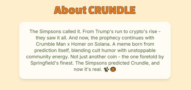 Crundle (CRND) 是一种基于Solana区块链构建的meme 币,围绕动画电视剧《辛普森一家》的预测故事情节展开,将人物荷马·辛普森的形象与一个名为“Crumble Man”的人物结合在一起。