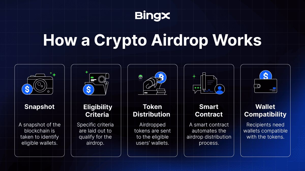 加密货币空投是指区块链项目向用户的钱包分发免费代币,以促进采用并奖励早期支持者。项目可能会对符合资格的钱包进行快照,或要求运行简单的任务,例如交易、质押或加入社群,然后再分发代币。