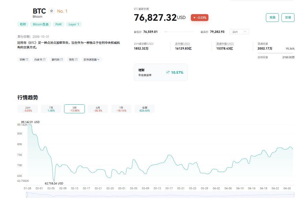 2026 年 4 月 28 日,比特币价格报 76,732 USDT,过去 20 天内最高触及 79,455 USDT。从技术指标来看: