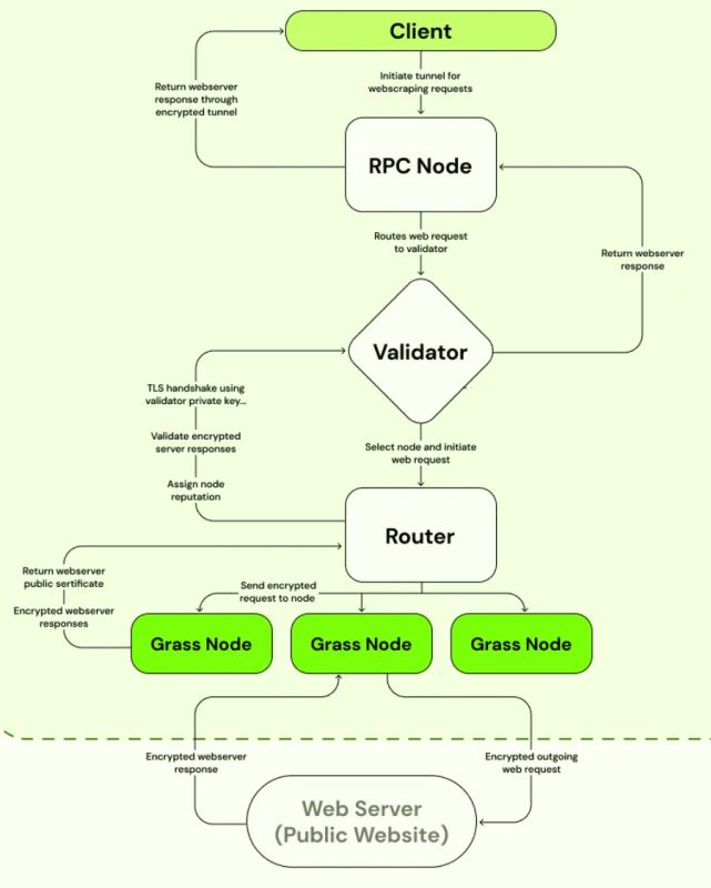 本质上,Grass 创建了一个由数千台用户设备组成的网络,从网站收集信息,然后将其传递给感兴趣的客户,主要用于训练人工智能模型。网络的输入端是客户端,它发出 Grass 请求以从特定来源获取数据。输出端是包含所需信息的 Web 服务器。协议的任务是将客户端的请求定向到特定节点,该节点将联系服务器进行数据抓取、加密并将其发回。