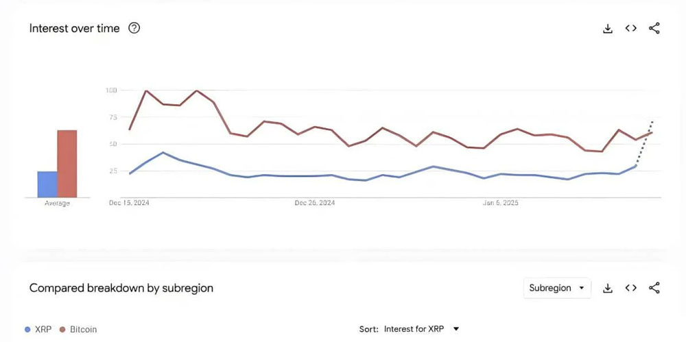 值得注意的是,XRP在Google搜索热度上的表现也不容忽视。根据Google趋势的数据,1月15日,XRP的全球搜索量首次超过了比特币。这标志着XRP在公众关注度上的上升,也表明了市场对该代币的浓厚兴趣。