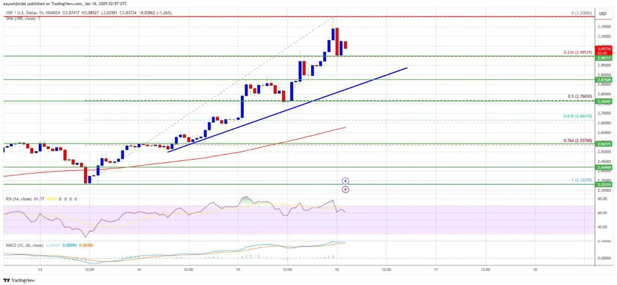 根据技术分析,XRP价格自突破2.80美元区域后,持续走强,涨幅超过10%,并突破了2.850美元和2.92美元的阻力位。当前价格站稳2.80美元支撑位,并维持在100小时简单移动平均线之上。若突破3.20美元的关键阻力位,XRP可能继续上涨,并挑战3.32美元或更高的水平。