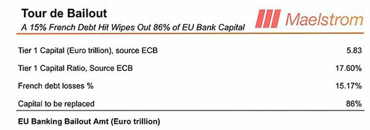 我们首先来关注一下,如果持有法国资产的外国持有者遭遇困境,会对欧元金融体系造成什么影响。记住,这个“富加齐”(美军越战时期的俚语,意为“坏到无法修复”)金融体系是一个碎片化的体系。一个实体的资产,往往是另一个实体的负债。所有资产都由一层薄薄的股权支撑。因此,如果在各欧盟金融机构计入资本的法国资产蒸发,破产就随之而来。