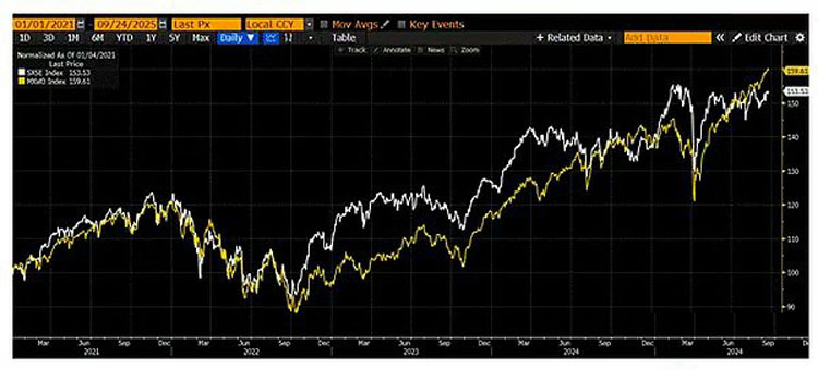 从 2021 年至今,EuroStoxx 50 指数(白色)的表现逊于 MSCI 全球指数(黄色)。