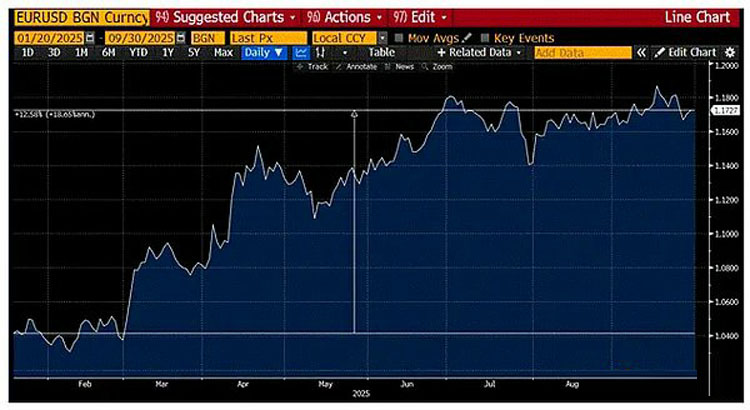 为了以牺牲德国和其他欧盟国家出口为代价来增加美国出口,贝森特必须大幅削弱美元兑欧元的汇率。继续维持巨额赤字,宣布一项产业政策并随之引发银行信贷激增,黄金大涨,在一切客观指标都表明美国经济强劲甚至非常强劲的情况下威逼美联储降息等等,这些政策在其他条件不变的情况下,都将削弱美元兑包括欧元在内的大多数其他法定货币的汇率。贝森特正忙于贬低美元以增强“美国治世”的制造业复苏,而拉加德则忙于推行紧缩的货币政策,以约束那些想要花钱推行民粹主义政策的成员国民选政客。这就是为什么自特朗普上任以来,欧元兑美元升值了12%。