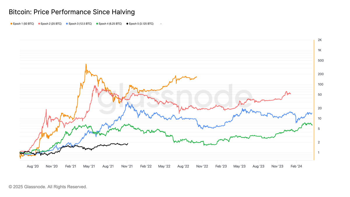 历史数据显示,比特币通常在减半后365至550天达到周期高点。截至周六,距上次减半已有533天,这使其完全处于历史大涨的时间窗口内。
