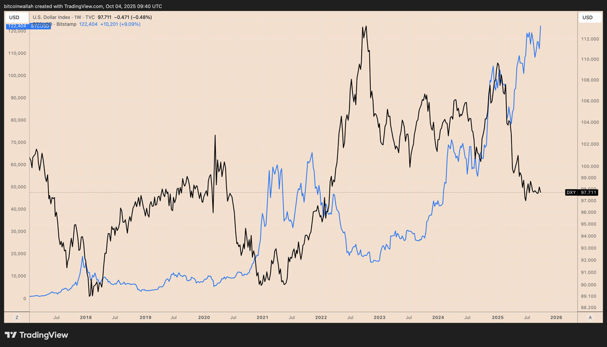 美元指数与比特币:每周表现对比图。来源: TradingView