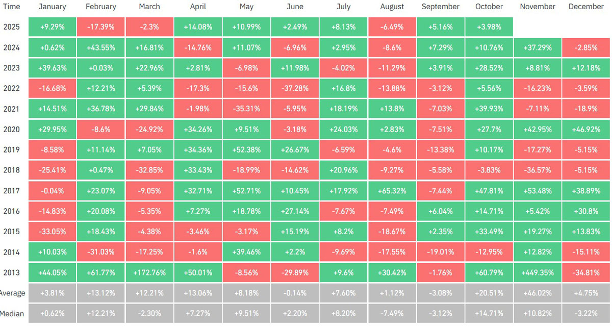 根据CoinGlass数据,比特币平均月度回报率约为:10月20%、11月46%、12月约4%。