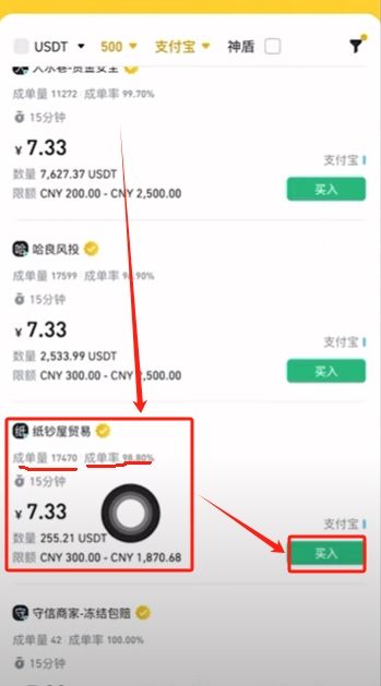 这时币安就会按照我们的金额和支付方式给我们匹配好商家。我们要找成单量和成单率多的商家来进行购买。因为成单量和成单率高的那帮人,他们是最好的。就相当于是他们是比较有实力的一些商家。最低要挑选成交量大于3000,成单率大于98%的商家。他整个的排价顺序都是由低到高的。因为我们想买入,所以当然想去购买价格便宜的。