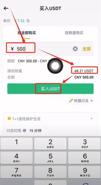 再次输入一下我们要购买的金额。输入完之后,下面就会自动帮我们算出来,支付500人民币将收到68.21颗USDT。