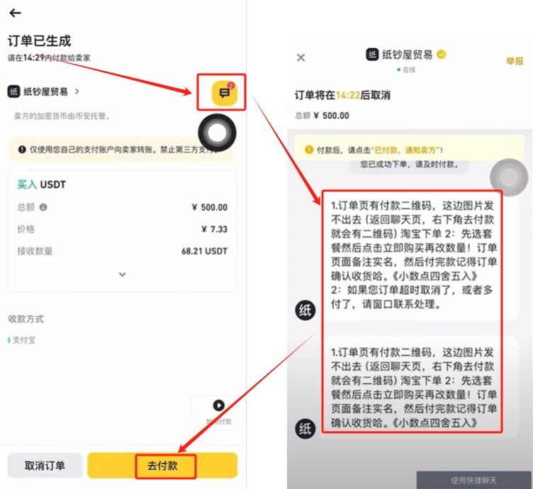 根据商家提供的支付方式给他转钱,转完钱之后点击【我已经付款,通知卖家】,请他把数字货币放给我们。