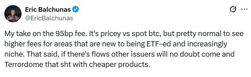 "我对95个基点费用的看法。相比现货BTC价格昂贵,但对于ETF化的新领域和日益小众的领域来说,看到更高的费用是相当正常的,"他说。