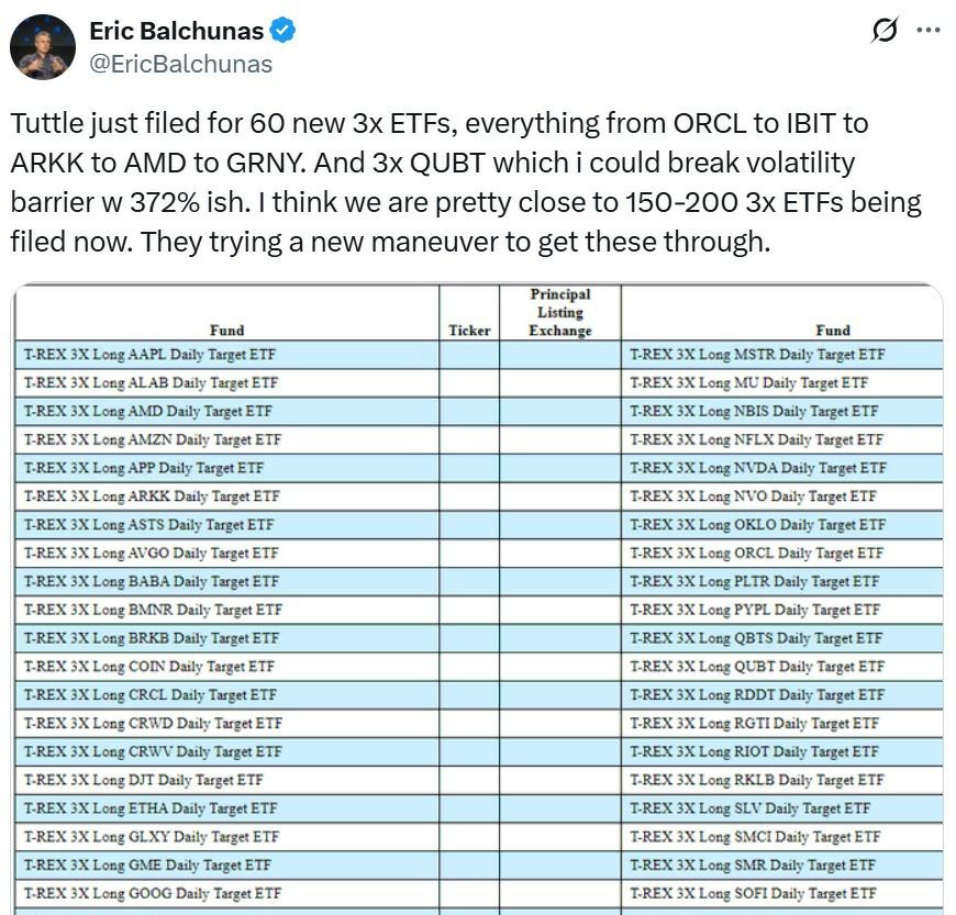 据Balchunas和Seyffart称,尽管美国政府可能处于停摆状态,但公司仍在申请新的ETF,重点关注3倍杠杆基金。