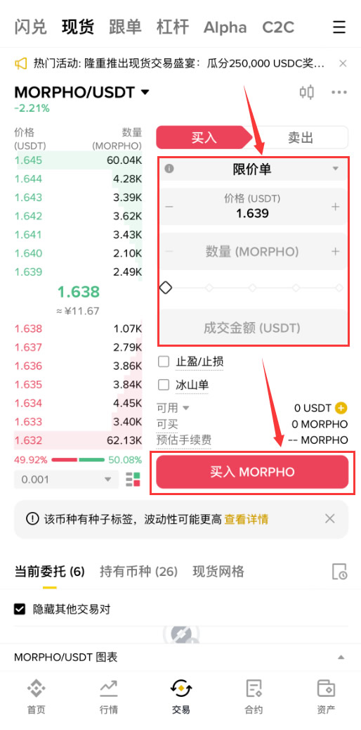 5、依次选择【限价单】-购买【价格】-购买【数量】-【成交数量】,设置好之后,点击【买入Morpho】。