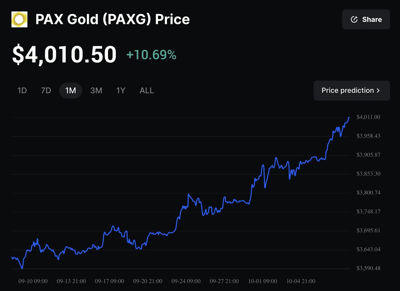 与可能涉及交易对手风险和交易时间有限的传统黄金交易所交易基金(ETF)不同,这些代币在加密货币交易所提供24/7 流动性,并可进行链上可验证审计。根据Yahoo Finance 于2025 年10 月7 日的数据,价格紧密追踪现货黄金,目前交易价格接近每盎司3,989 美元,此前在2025 年10 月7 日短暂突破4,000 美元。这种可近性扩大了参与度,特别是对于寻求部分所有权而无需实物储存物流挑战的零售投资者。