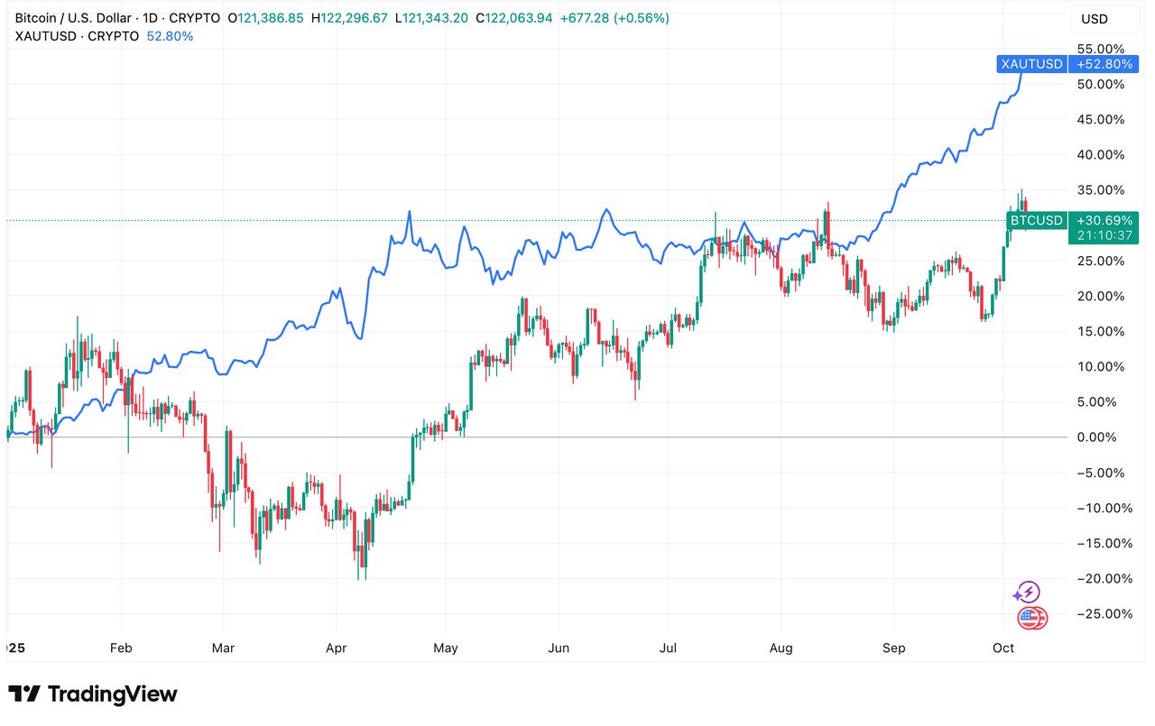 2025 年迄今黄金与比特币表现比较| 来源: TradingView