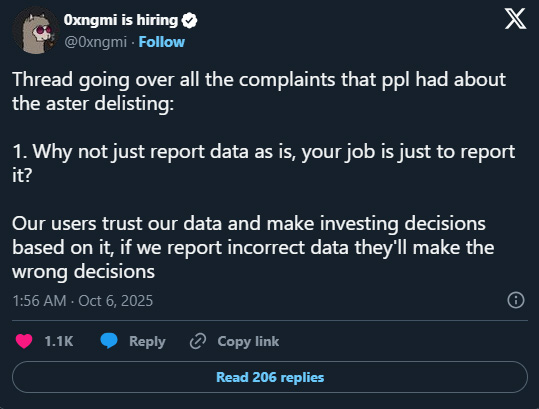 2025 年 10 月 5 日,成为 Aster 发展历程中的转折点。DeFi 数据平台 DefiLlama 宣布将 Aster 的永续合约交易量数据从其平台中移除,此举引发了关于 DeFi 数据真实性与透明度的激烈讨论。