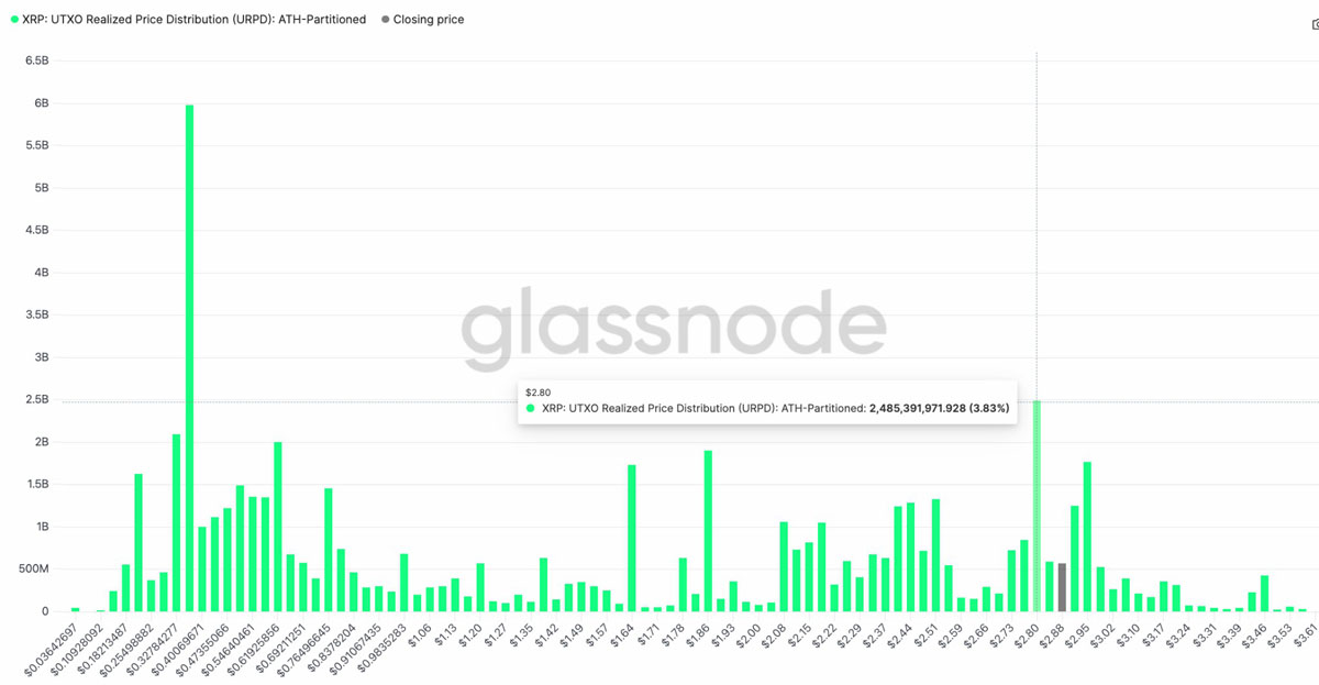 UTXO实现价格分布(URPD)显示,2.80美元附近形成强劲支撑,约有25亿枚XRP在该价位成交。