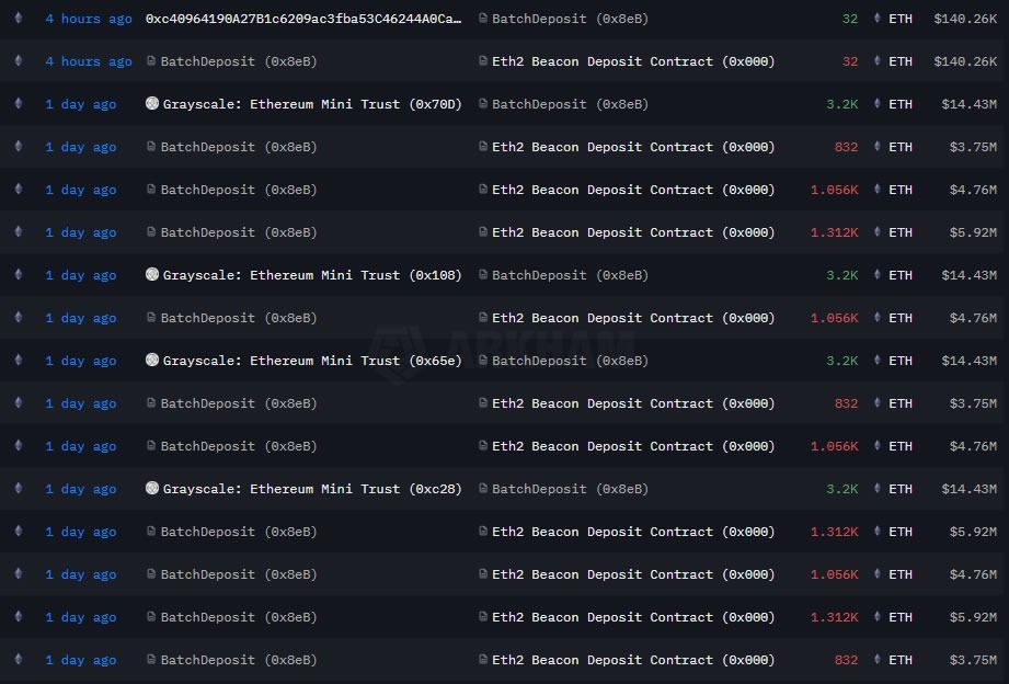 Arkham Intelligence数据显示,Grayscale在过去几天持续增持并质押以太坊,为新推出的以太坊质押项目注入了数亿美元资金,这些资金全部存入信标链。