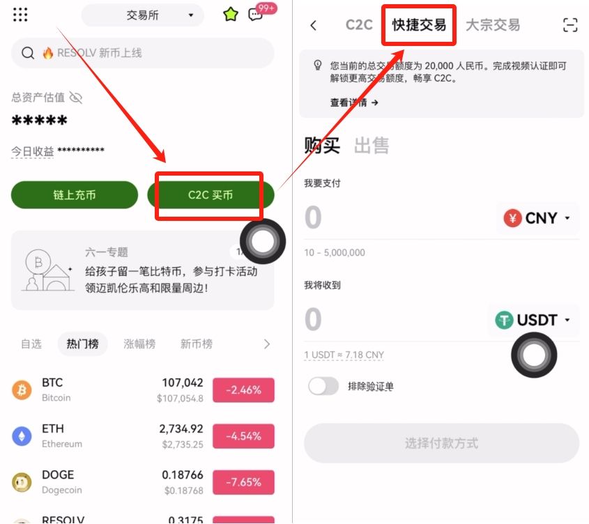 然后我们就可以使用C2C的快捷买币来购买USDT了。