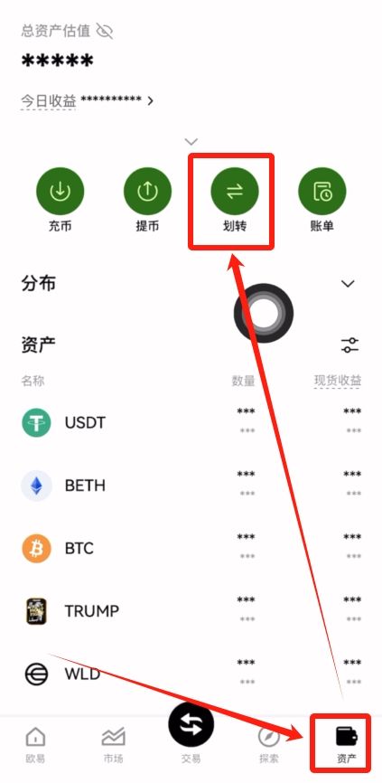 当你购买了USDT之后,就相当于是购买了美元。我们在资产的页面找到【划转】。