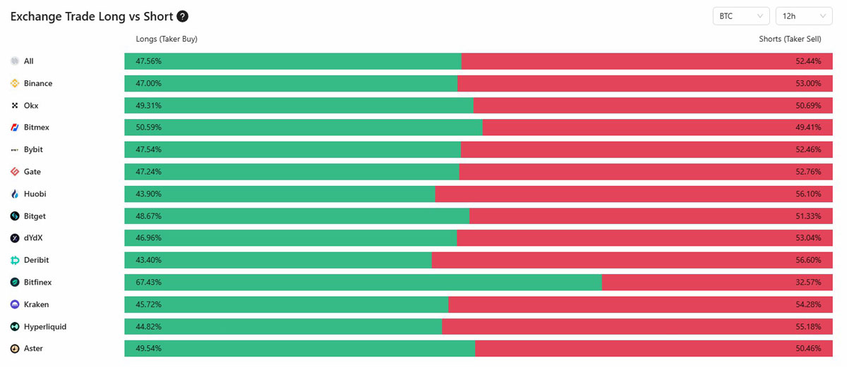 根据CoinAnk的区块链数据,目前所有交易所中超过52%的比特币持有者处于空头状态,意味着他们押注比特币价格下跌,而47%仍保持多头。