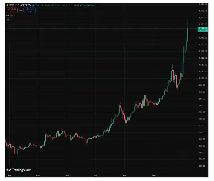 * BNB 突破历史新高,目前交易价格约为 1,250 美元。