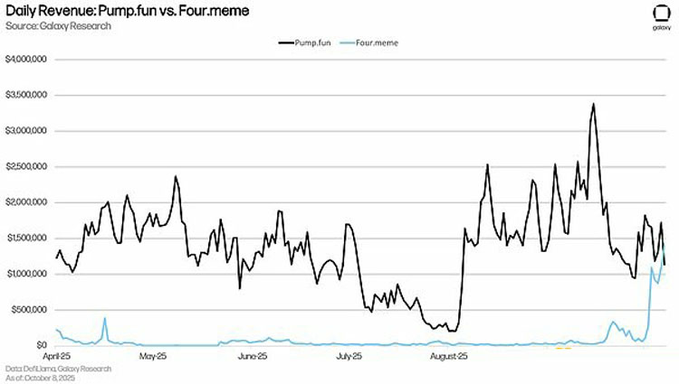 截至撰写本文时(10 月 8 日),Four.meme 的 24 小时收入已超过 Pump.fun,为 140 万美元,而 Pump 为 114 万美元。