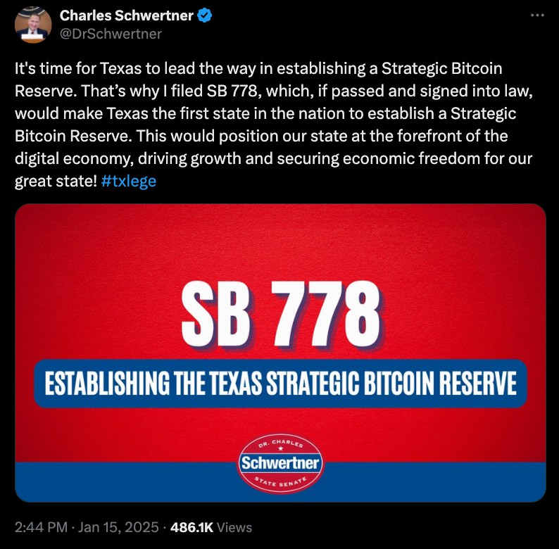 "我们是唯一一个真正投入主 权资金、纳税人资金用于储备的州,"Schwertner说,并补充道:"我们全力建立储备以及背后的资金支持。"