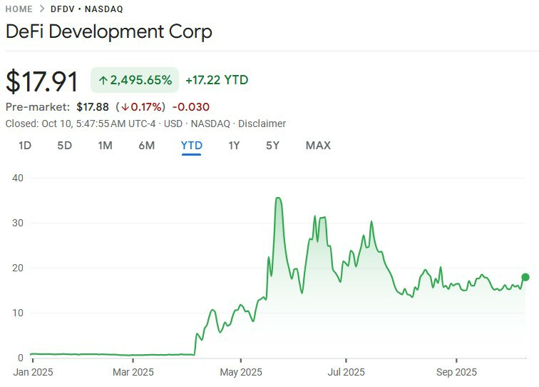 DFDV,前身为房地产平台 Janover,自 Solana 财务重塑品牌以来,今年表现最佳的股票之一。来源:Google Finance