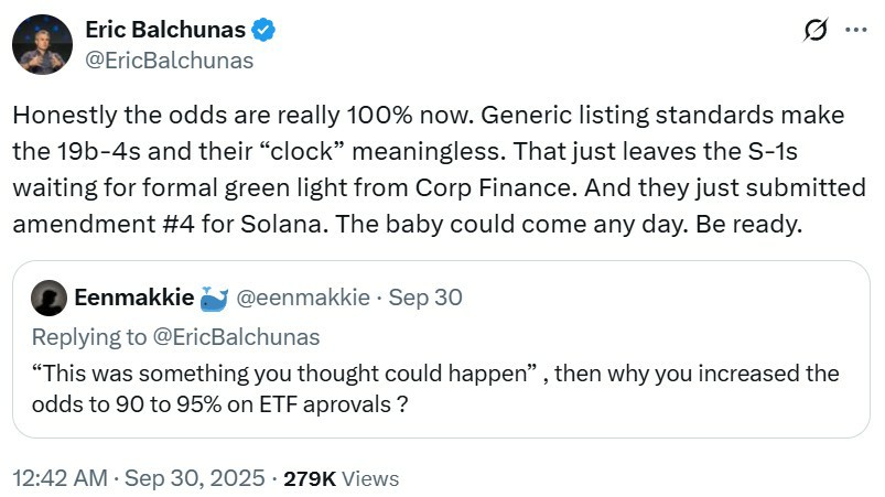 彭博分析师认为 Solana ETF 不被批准的可能性为0%。来源:Eric Balchunas