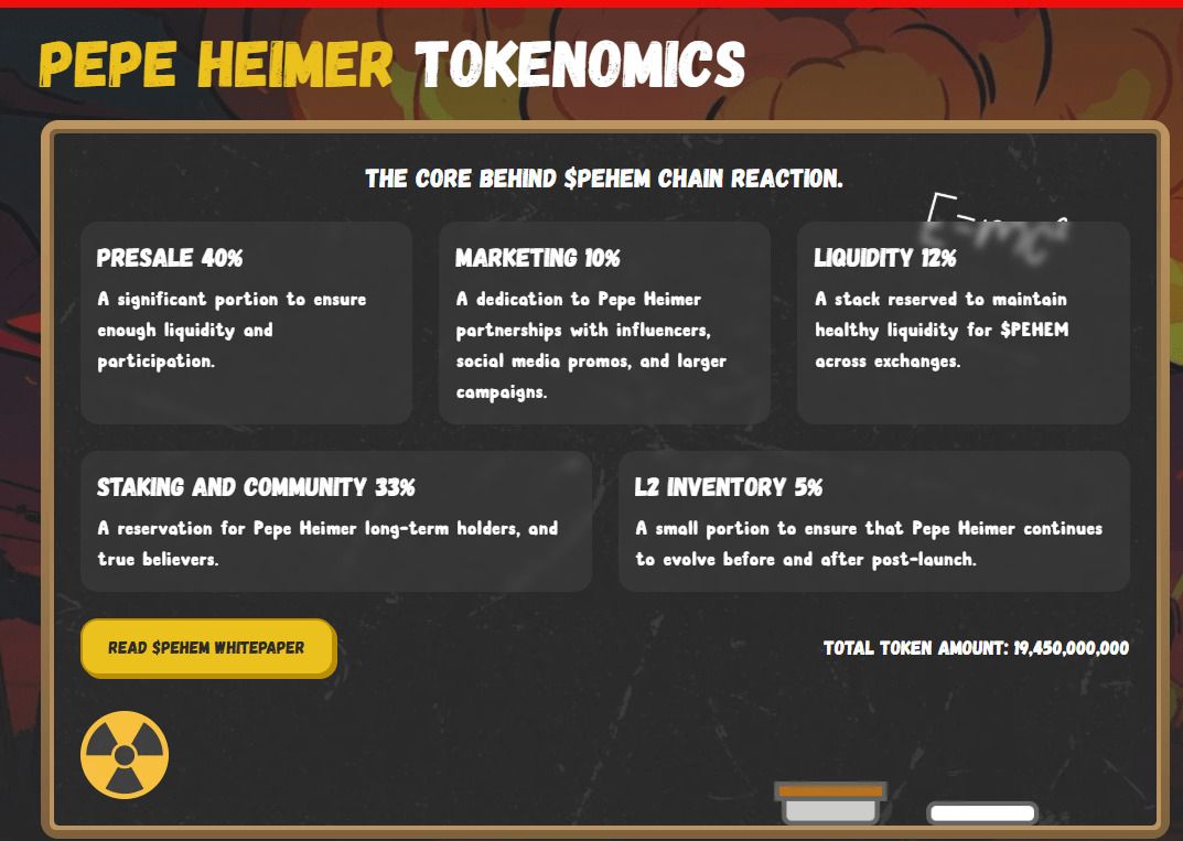 Pepe Heimer 于 5 月 15 日启动了其原生代币 $PEHEM 的预售。根据其代币经济学,此次预售计划将向早期投资者提供 $PEHEM 总供应量的 40%。预售分为多个阶段,逐步提高代币价格。