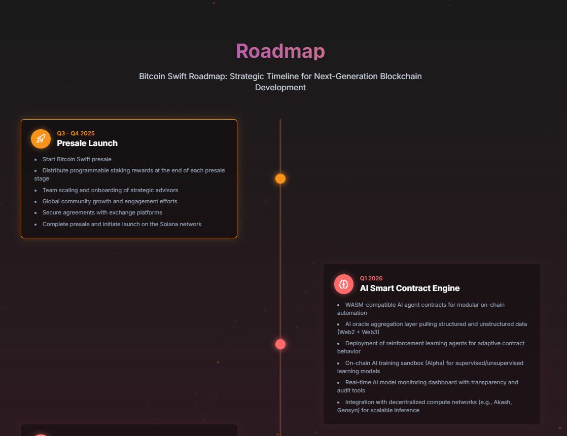 展望未来,比特币Swift的开发路线图涵盖2025年第三季度至2026年第四季度。比特币Swift的前景一片光明。比特币Swift拥有一份充满激动人心的里程碑的全面路线图,展现出巨大的可持续增长潜力。