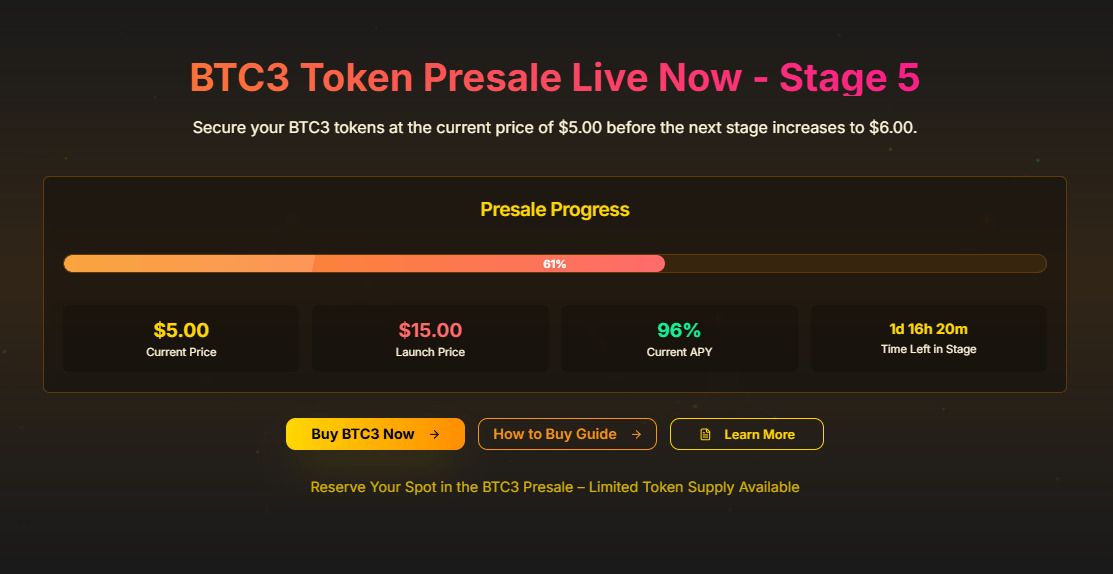 第五阶段已备受关注。BTC3 的定价为 5 美元,下一阶段将推动其价格升至 6 美元,而确认的发行价锁定在 15 美元。第五阶段目前的年化收益率 (APY) 为 96%。此次预售势头迅猛,因为它不仅仅是购买代币。它意味着从第一天起就能进入 BTC3 生态系统,参与者可以参与链上治理,并通过可编程奖励获得收益。