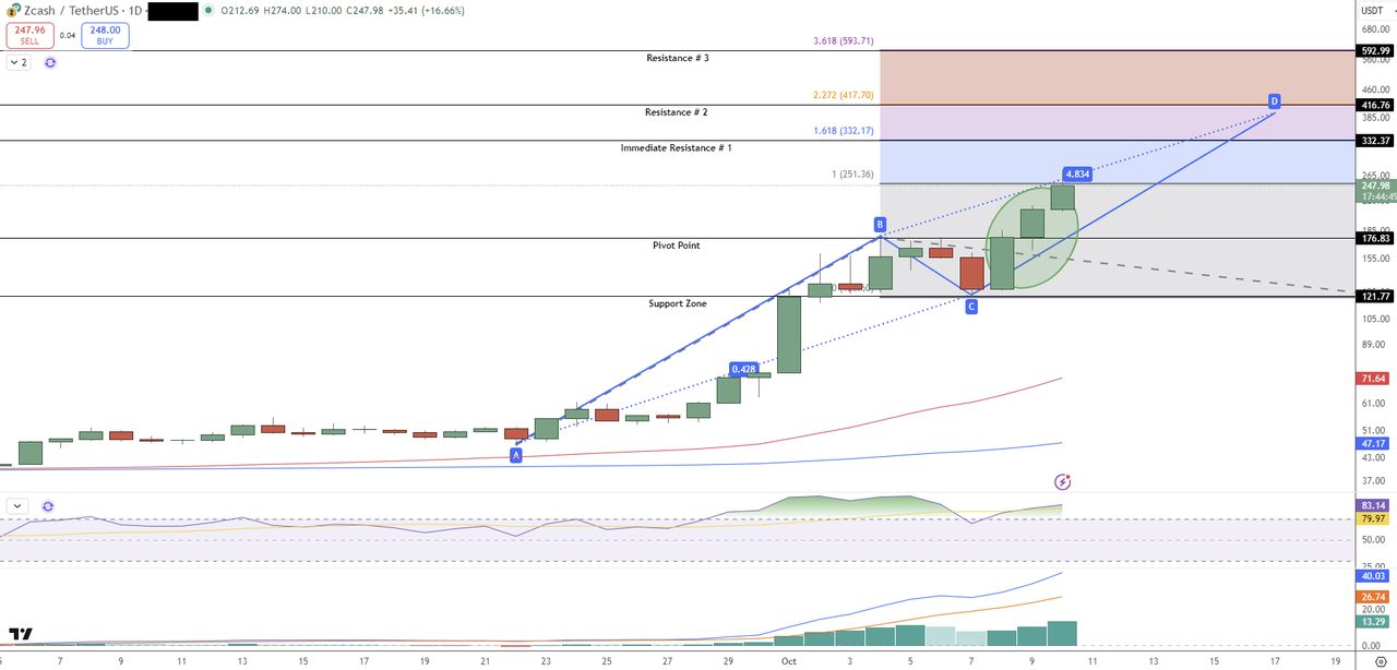 从下行方面来看,$176 仍是关键支撑;跌破它可能会暴露 $121.7。总体而言,ZEC 在谐波连续结构中仍保持技术性看涨,尽管交易者在追逐更高点之前应监测超买信号。